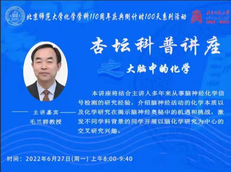 从2022年6月27日(周一)上午开始,将开展北京师范大学化学学科110周年庆倒计时100天系列活动中部分讲座的直播分享,欢迎感兴趣的老师、同学关注,上线观看。特别适合化学化工医药相关专业大一大二学生学习,热烈欢迎!