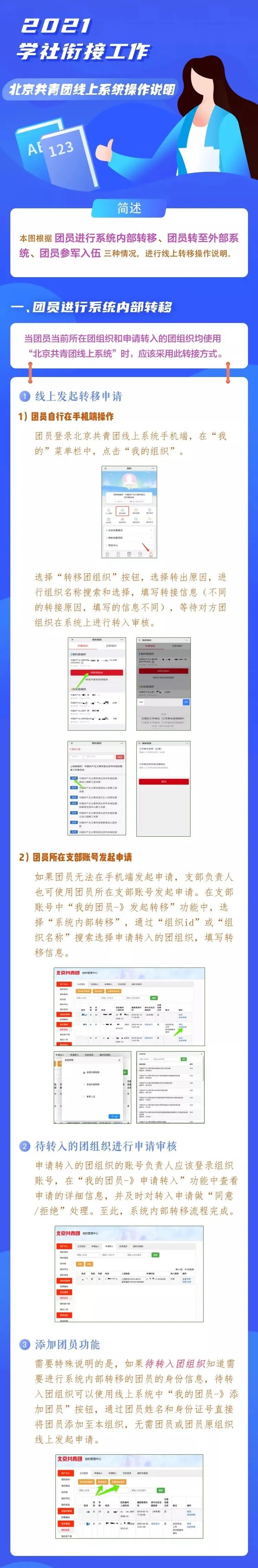 各类学校团组织将于新生入学一个月内,在各类线上系统创建新生所属团组织,并审核接收新入学的学生团员团组织关系转接申请。转出团组织和团员本人可在录取学校新生团组织创建后,登录北京共青团线上系统申请将组织关系转出。转出团组织不得将已升学的毕业学生团员组织关系转至团员居住地或户籍所在地团组织。