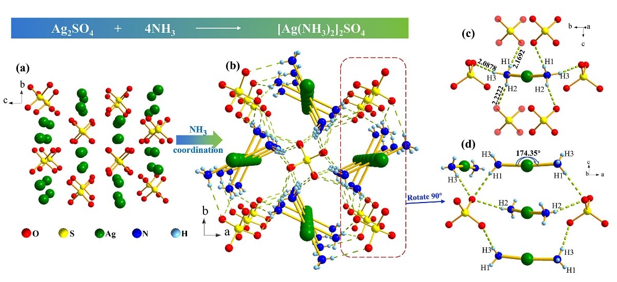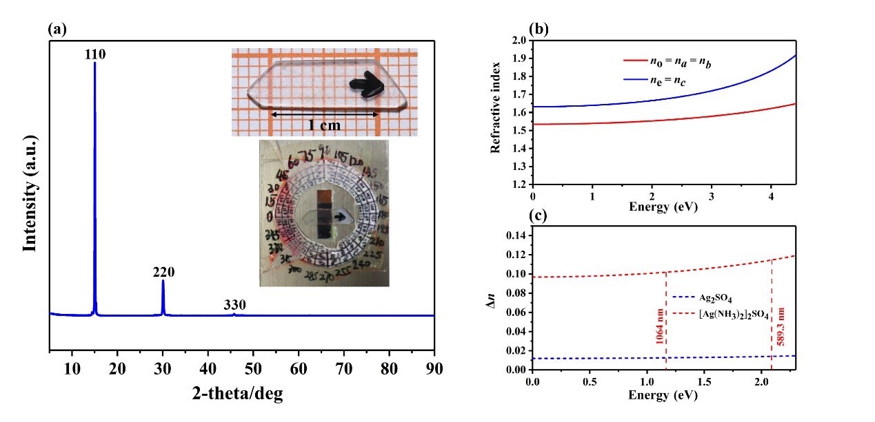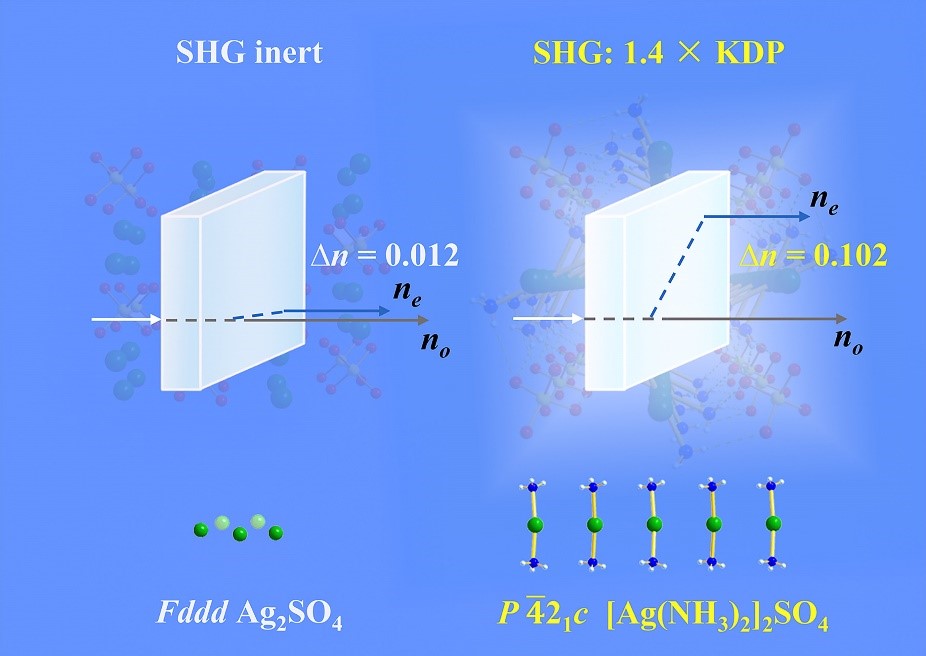 近期,bat365官网登录入口吴立明、陈玲教授课题组提出了一种阳离子的配位策略,实现了材料的非线性和线性光学性能提升。在该工作中,他们通过引入中性配体NH3对 Ag+ 进行配位,驱动了Ag2SO4结构从中心对称Fddd空间群向非中心对称四方P421c结构的转变,使得该体系从非线性光学惰性到非线性光学活性的转变。同时与Ag2SO4相比较(∆ncal = 0.012 @ 1064 nm),[Ag(NH3)2]2SO4晶体呈现出显著的双折射率提升(∆nexp = 0.08 @589.3 nm,计算值∆ncal. = 0.102 @ 1064 nm)。理论研究证明,[Ag(NH3)2]2SO4晶体的大双折射率特性主要来源于配位后的特殊的阳离子次结构。由于[Ag(NH3)2]+的两个配体NH3沿c轴方向形成一个N-Ag-N夹角,这使得阳离子次结构沿c轴产生了一个0.12 D的偶极,而化合物在ab平面上的偶极为零。由于该偶极可与入射光振荡电磁波产生相互作用,使得电磁波的运动在c轴方向被迟滞,从而导致该材料具有大双折射率的光学各向异性。另外,[Ag(NH3)2]2SO4表现出较大的相位匹配的SHG强度(1.4 × KDP @1064 nm),DFT理论计算表明,[Ag(NH3)2]2SO4的SHG响应由阳离子[Ag(NH3)2]+和阴离子SO42-共同贡献。上述研究结果表明在该材料中阳离子对NLO相关性能具有主要的贡献,因此该报道提出的阳离子的配位结构修饰策略,将为非线性光学材料的设计和性能提升提供新的思路。