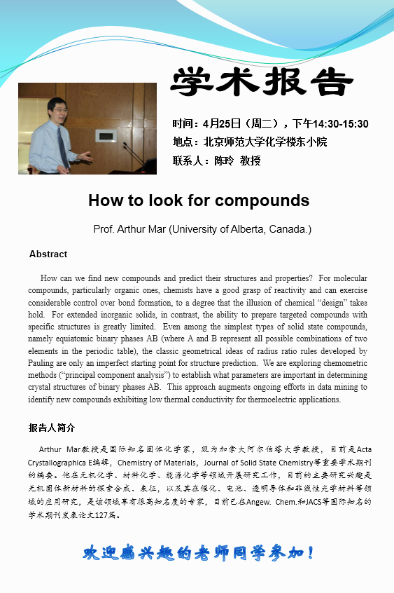学术报告:University of Alberta, Prof. Arthur Mar, How to look for compounds