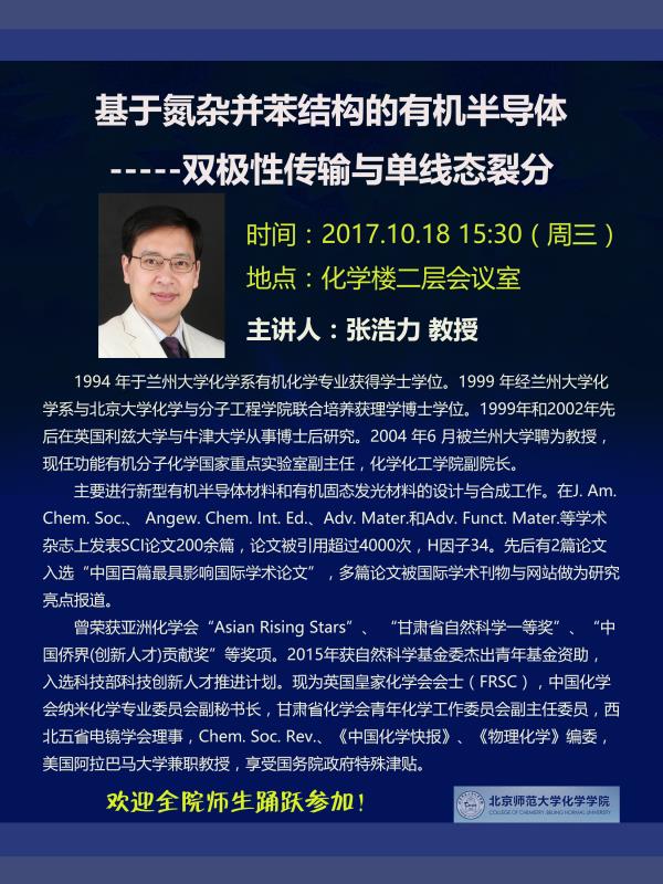 学术报告:兰州大学,张浩力教授,基于氮杂并苯结构的有机半导体----双极性传输与单线态裂分