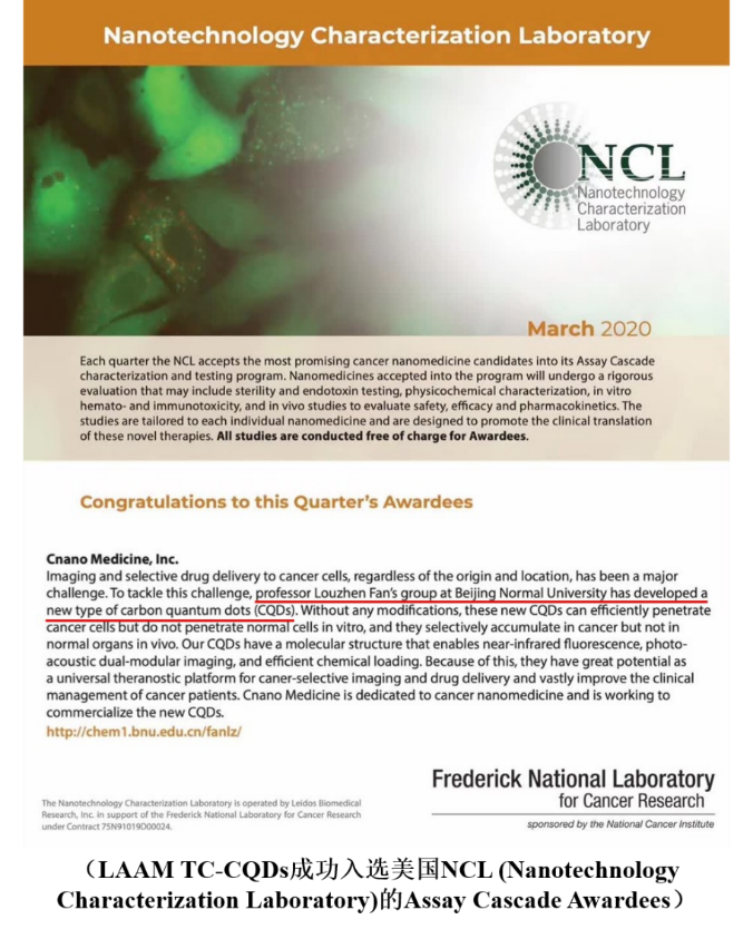该研究工作近期发表在《Nature Biomedical Engineering》杂志上 (Targeted tumour theranostics in mice via carbon quantum dots structurally mimicking large amino acids)。bat365官网登录入口为第一完成单位。bat365官网登录入口博士生李淑花,宿雯和吴浩为论文的共同第一作者,范楼珍教授、朱嘉副教授和耶鲁大学周江兵教授为共同通讯作者。相关技术成果已经申请了国际发明专利(PCT/CN2019/115263)。LAAM TC-CQDs成功入选美国NCL (Nanotechnology Characterization Laboratory)的Assay Cascade Awardees。NCL将为这一项目提供免费临床前安全评价、药效和药物代谢等实验。据悉,这是来自中国大陆的首例入选项目。该研究得到国家自然科学基金,理论及计算光化学教育部重点实验室和放射性药物教育部重点实验室资助。