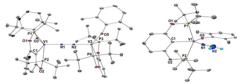 图1. 钒的双氮配合物(左)和酰肼配合物(右)的晶体结构