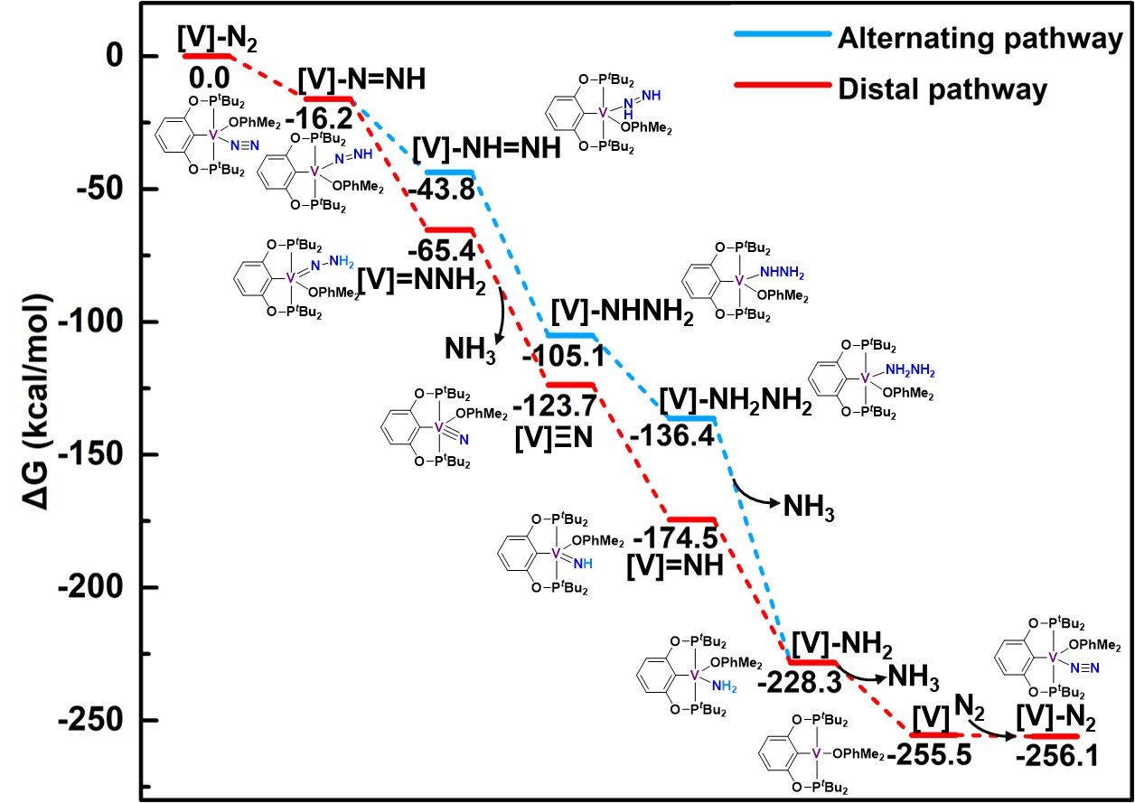 近日,北京师范大学胡少伟教授和崔刚龙教授课题组合作,通过理论计算和实验研究相结合的方式报道了钒金属配合物催化氮气还原为氨气,并首次从氮气活化体系分离和表征了中性酰肼配合物中间体([V]=NNH2),通过钒的氨基配合物([V]NH2)还原质子化反应得到双氮化合物和释放氨气模拟了催化循环转化过程,结合理论计算阐明了在该催化体系中氮气可能经过端位反应途径(distal pathway)转化为氨气。研究表明,带有POCOP和芳氧基辅助配体的钒配合物作为一个独特的系统可稳定活性含氮物种(NxHy)并促进N2-to-NH3的催化转化,从而为理解生物固氮,特别是对于目前研究较少的铁钒固氮酶的机理提供了更多的视角,为设计出更为高效的合成氨催化剂提供了新的思路。