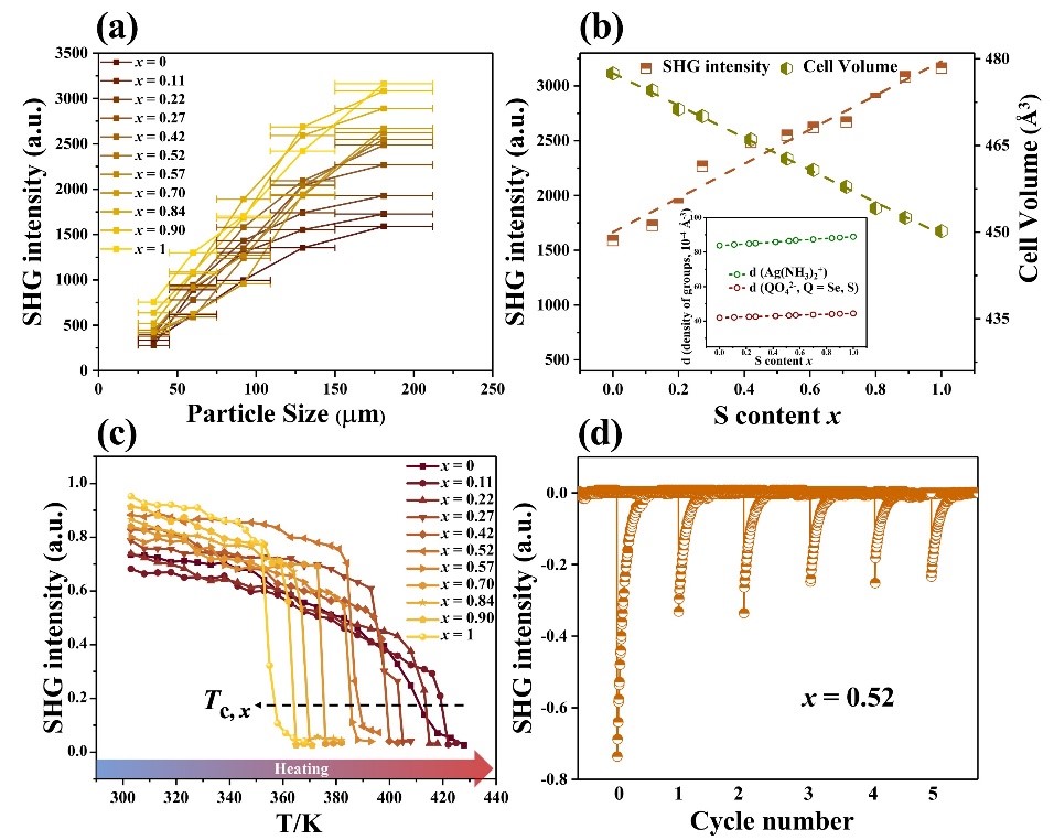 21c,RTP)到中心对称高温相(I4/mmm,HTP)的有序-无序可逆相变,该相变实现了热刺激下氢键驱动的近室温非线性光学开关性能(Jacs Au, 2022, 2, 2059−2067)。在上述工作的基础上,bat365官网登录入口吴立明、陈玲教授课题组近期研究了与[Ag(NH3)2]2SO4同晶型化合物[Ag(NH3)2]2SeO4,研究发现该晶体也具有优异的非线性光学性能(较强的倍频强度:1.3 × KDP,大双折射率:Δnobv. = 0.08)。进一步,他们获得了系列同晶型固溶体,[Ag(NH3)2]2SxSe1-xO4 (x = 0−1.00), 均表现出优异的非线性光学开关性能,并且随着x的变化,光学开关温度Tc在356 K–430 K范围内的实现调控。更有趣的是,该系列固溶体光学开关温度Tc对于组分x现线性变化,遵循