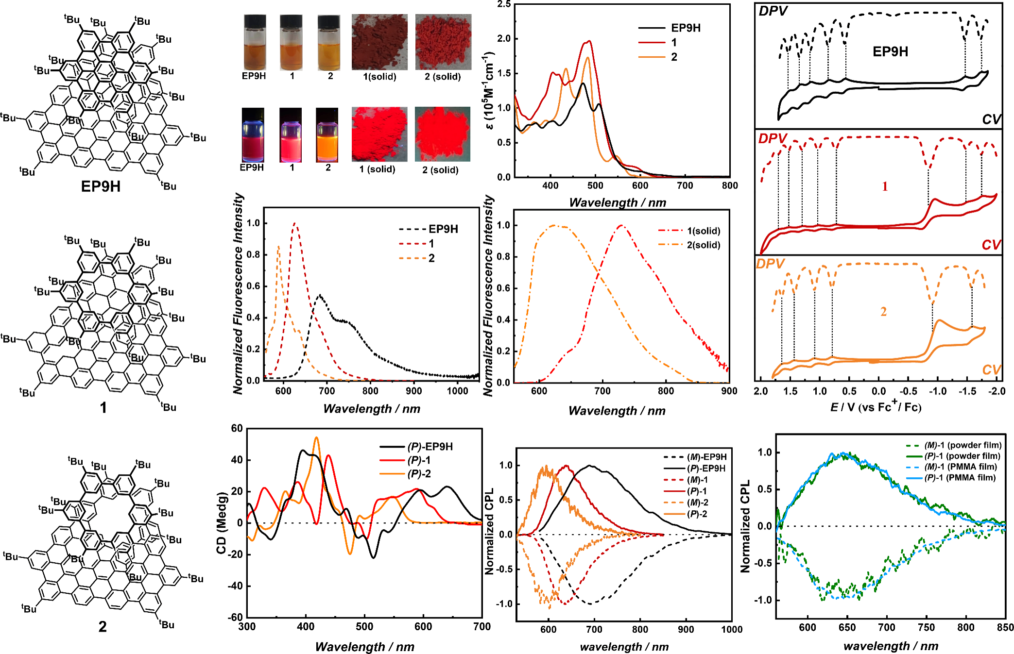 本工作采用自下而上的合成策略将孔缺陷引入到全共轭的π-扩展螺烯分子,系统研究了缺陷的引入对结构和基本光电性质以及手性光学性质的规律性影响。发现具有聚集引起淬灭 (ACQ) 特性的无缺陷的扩展螺烯可以转化为具有双态发射 (DSE) 和双态圆偏振发光特性的新型螺烯分子,在固相圆偏振发光(CPL)中也显示出潜在的应用价值,并为进一步开发具有双态发射的全碳氢纳米石墨烯提供了新的策略。