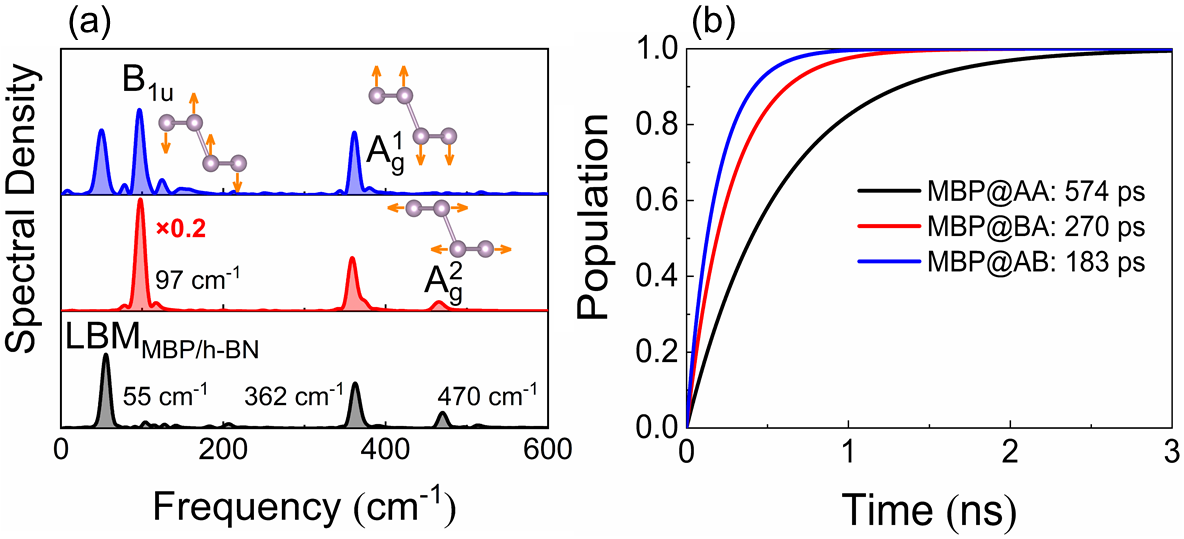 图2a给出了三种体系MBP带隙的声子谱,与电子自由度耦合的振动模式主要包括层间呼吸模式(LBMMBP/h-BN)、低频面外模式(B1u)、高频面外模式(