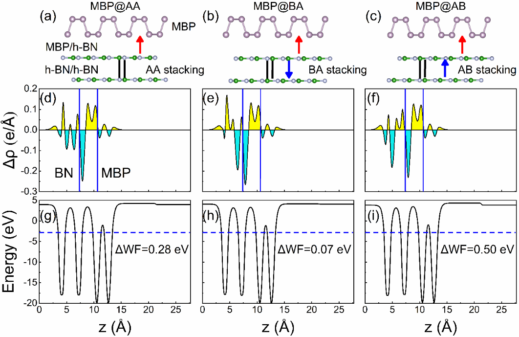 为了回答这一关键科学问题,北京师范大学龙闰教授和方维海院士课题组,构建了无极化的AA、极化向上BA和极化向下AB构型的双层h-BN,据此,进一步构建了无极化MBP@AA(图1a)、极化向上MBP@BA(图1b)和极化向下MBP@AB(图1c)异质结。每个异质结都包含两个界面:MBP/h-BN和h-BN/h-BN界面。差分电荷(图1d-1f)表征了电荷转移方向(图1a-1c的红色和蓝色箭头),界面的电荷转移导致了真空层两侧功函数差(图1g-1i)。