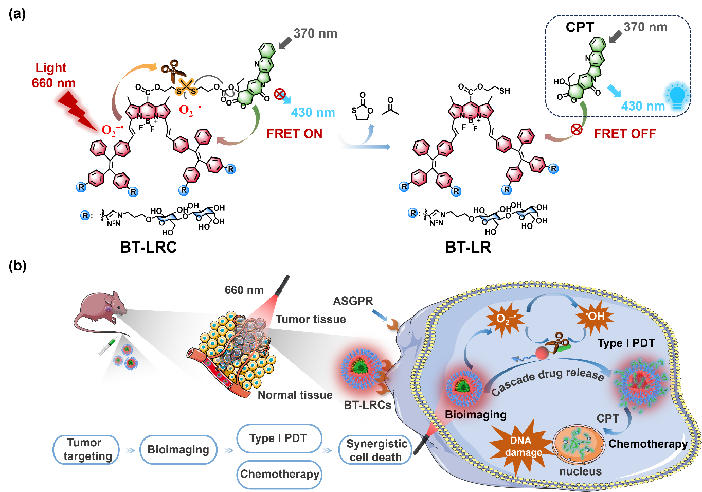 针对上述问题,北京师范大学邢国文教授课题组报道了一种乳糖修饰的光笼分子BT-LRC,通过超氧阴离子自由基(O2−•)可切割的缩硫酮键将喜树碱(CPT)共价连接到氟硼荧-四苯乙烯(BODIPY-TPE)杂合荧光团上,光照下实现了I型光动力治疗(PDT)和抗癌药物光控释放。两亲性的BT-LRC在水溶液中自组装成具有聚集诱导发光(AIE)性质的活性纳米粒子(BT-LRCs)。乳糖基团与肝癌细胞(HepG2)表面去唾液酸糖蛋白受体(ASGPR)的特异性结合显著增强了BT-LRCs的肿瘤靶向能力。BT-LRCs可以在红光光照下产生大量的O2−•,有效切割缩硫酮键,迅即释放出DNA损伤剂CPT。体内实验研究表明,该自组装光控纳米前药系统在肝癌荷瘤小鼠模型中表现出很好的光疗和化疗协同抗肿瘤效果。该工作为抗乏氧型的糖基化光笼分子在可视化光控释药和精准靶向治疗中的应用提供了新的研究思路。