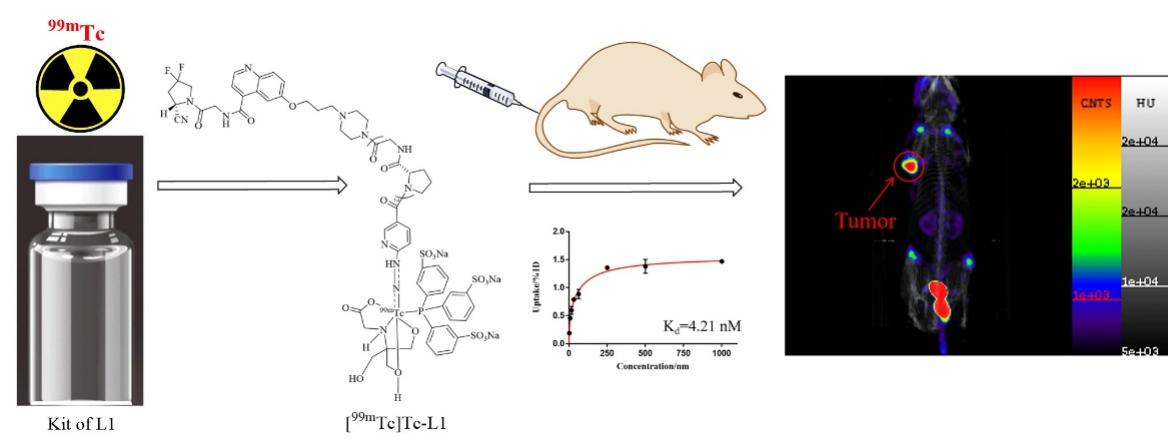 成纤维细胞激活蛋白(FAP)在大多数实体瘤基质中选择性表达于癌相关成纤维细胞(CAFs),是肿瘤诊断和治疗的潜在靶点。通过放射性核素标记成纤维细胞激活蛋白抑制剂(FAPI)及其衍生物用作肿瘤显像剂成为当前国际放射性药物研究的一大热点。99mTc是临床上应用最广的SPECT核素,理想的99mTc标记的FAPI类肿瘤显像剂还未研制成功,因此研制安全有效且质量可控的99mTc标记的FAPI肿瘤显像剂具有非常重要的现实意义。肼基尼古酰胺(HYNIC)作为一种常用双功能联接剂,其可以与三羟甲基甘氨酸(tricine)和三苯基膦三磺酸钠(TPPTS)作为协同配体来制备稳定的99mTc 标记的HYNIC配合物。连接剂(linker)连接了靶向基团和与放射性核素相连的螯合基团,对于调节放射性药物与靶点的亲和性和在生物体内的生物分布性能发挥重要作用。相关研究表明-(Pro-Gly)n-具有II型聚脯氨酸螺旋结构,可以通过调节肽链的长度来改变空间构象,从而优选出与靶点具有更高亲和力的肿瘤显像剂。基于以上考虑,张俊波教授团队设计合成了分别含有-(Pro-Gly)2-和-(Pro-Gly)6-作为连接剂的两个FAPI衍生物(L1和L2),然后和协同配体tricine/TPPTS 与99mTc 配位制备稳定的99mTc配合物([99mTc]Tc-L1和[99mTc]Tc-L2)。体外细胞研究表明[99mTc]Tc-L1显示出更高的细胞摄取和与FAP的特异性结合。U87MG肿瘤小鼠的生物分布和microSPECT/CT图像显示,[99mTc]Tc-L1与FAP具有特异性结合,其在肿瘤中摄取高且肿瘤与非靶比值好。[99mTc]Tc-L1可通过药盒化制备,安全、有效且质量可控,具有非常广阔的临床应用前景。相关研究工作以“Synthesis and Evaluation of 99mTc-Labeled FAP Inhibitors with Different Linkers for Imaging of Fibroblast Activation Proteins in Tumors”为题发表在药物化学顶级期刊Journal of Medicinal Chemistry上。bat365官网登录入口博士生阮晴(已毕业,现北京师范大学在站博士后)、王倩娜(在读博士生)为共同第一作者,张俊波教授为通讯作者,北京师范大学为第一单位。