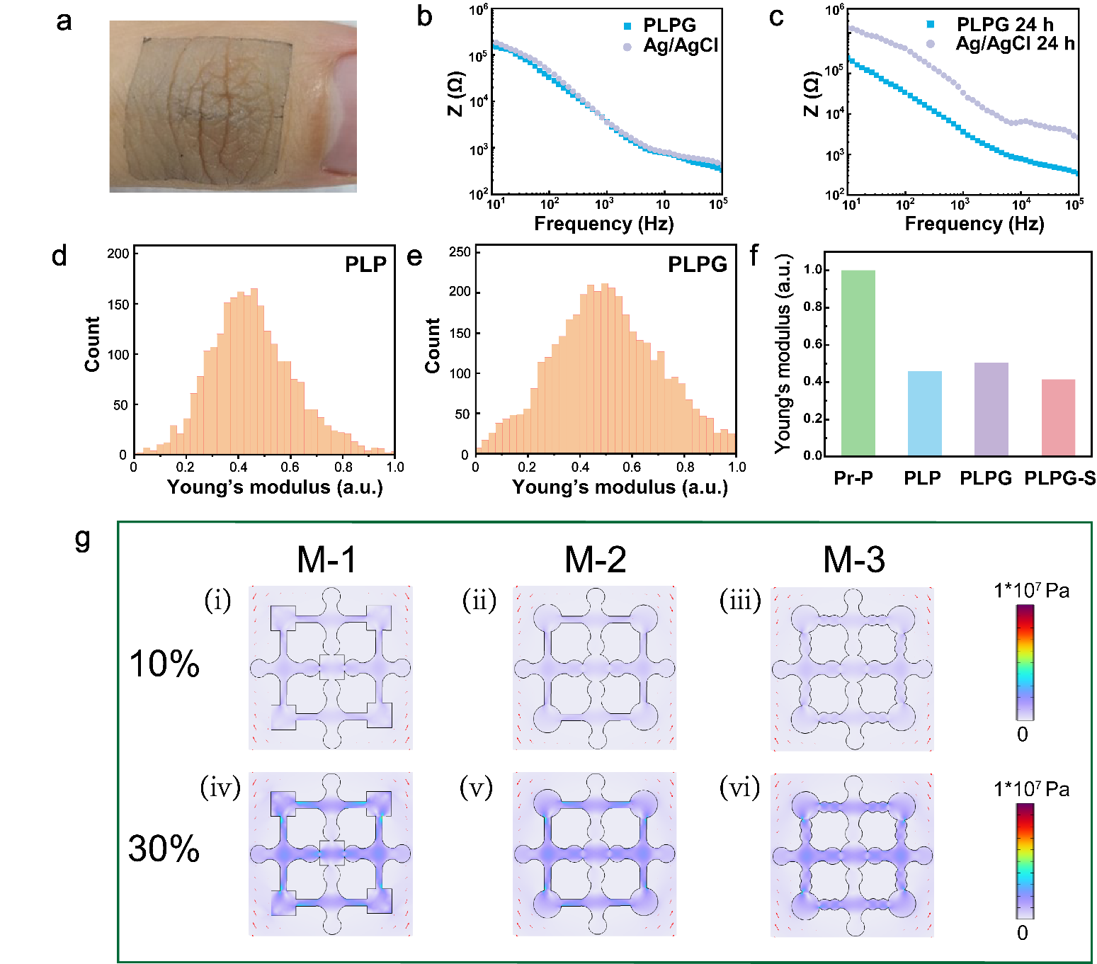 该PEDOT:PSS的超贴肤特性及优异的电学性质使其具有较低的电极/皮肤界面接触阻抗,与商用的Ag/AgCl电极相比,其在长期稳定监测电生理信号方面具有优势。通过对电极结构进行设计并利用有限元模拟进行应力分布分析,可筛选出具有最佳力学稳定性的电极结构,这对在动态条件下的低运动伪影电生理信号记录至关重要(图2)。