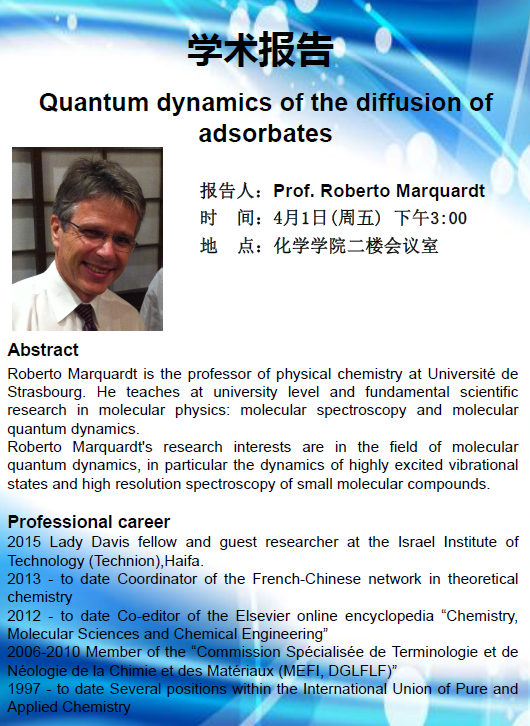 学术报告:法国斯特拉斯堡大学Roberto Marquardt教授----“Quantum dynamics of the diffusion of adsorbates”