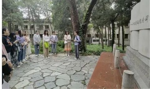 活动首先由白鸽青协讲解员向同学们介绍辅仁校园的建筑风格以及办学历史。20世纪二三十年代的辅仁大学,不仅是知名的学术阵地,更是爱国运动的前线。它见证了抗日战争、解放战争、新中国建立等重大历史事件,培养了众多爱国青年与学术人才,在中国近代教育史上写下了浓墨重彩的一笔。同学们在礼堂门口追念鲁迅先生1932年于此发表的抗日演说,在12·9纪念碑前回顾那段数千名北平青年学生涌上街头、高呼抗日口号的抗日救亡历史,在程明洳、张崑刚烈士的纪念碑前学习他们献身土地改革的光辉事迹。