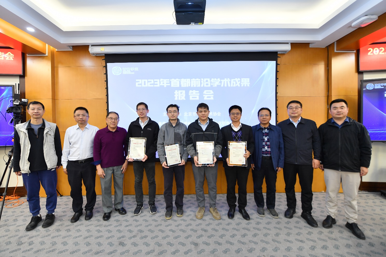 北京化学会秘书长孙根班教授介绍前沿学术成果遴选过程。北京化学会理事长方维海院士、北京市科学技术协会秘书长李金涛、bat365官网登录入口副院长崔刚龙、北京化学会秘书长孙根班等为前沿学术成果入选作者颁奖。
